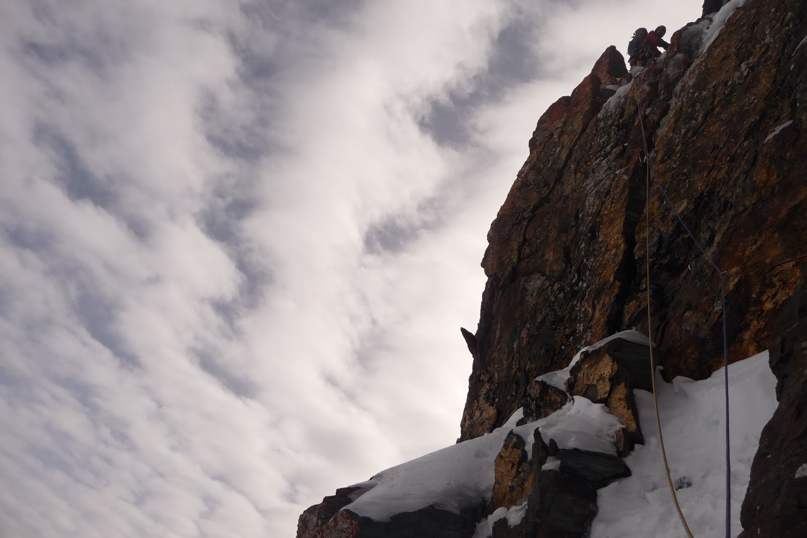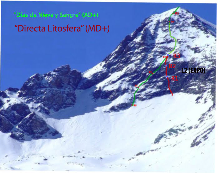La línea transcurre por el centro de la pared salvando las mayores dificultades. Un primero largo (muy largo) de hielo con unos 60 metros, al que para acceder la rimaya nos pondrá a prueba con un paso bastante explosivo. El segundo largo (EXPO) de unos 25 metros discurre por una fisura que sale a nuestra izquierda. Largo muy duro y técnico en el que meter seguros no es fácil, según yo lo veo la posibilidad de pararte a meter un seguro es remota, hay que estar bien fuerte. De todos modos, quedó allí un clavo salvador que pacientemente metí para futuras repeticiones; esperemos que nadie se lo quede (muy triste) o que la expansión de la roca por el frío no lo escupa.