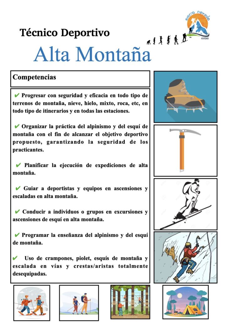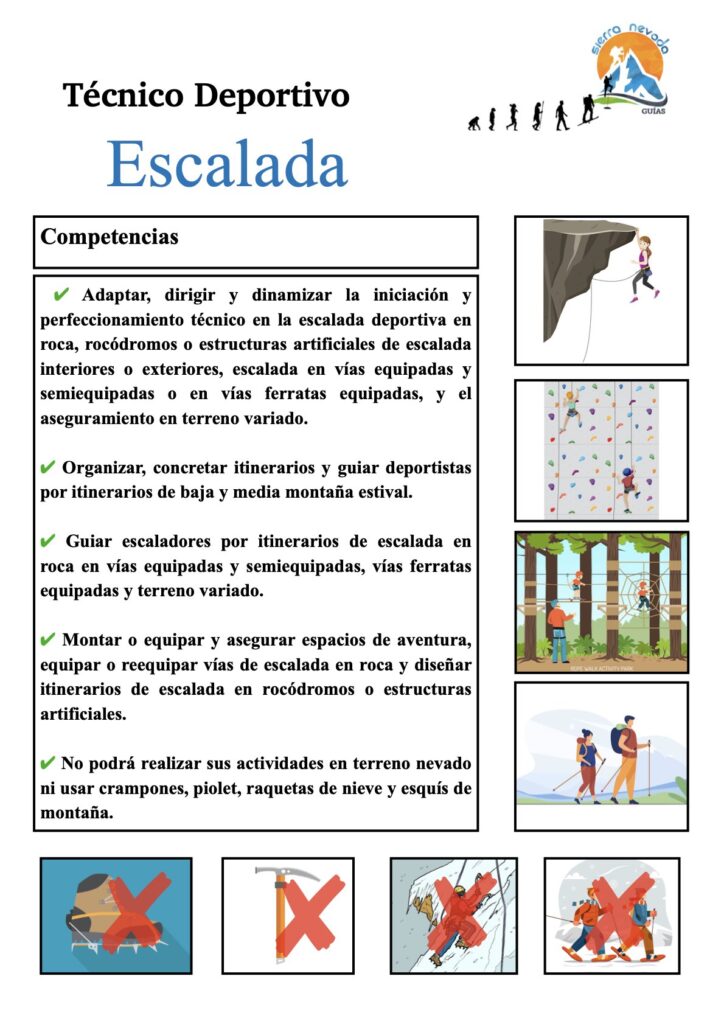 Dentro de los Técnicos Deportivos, tenemos diferentes modalidades o especialidades: Alta Montaña, Media Montaña, Barrancos y Escalada. En las siguientes imágenes, tenéis a modo de resumen las diferentes competencias que hay dentro de los propios técnicos deportivos: