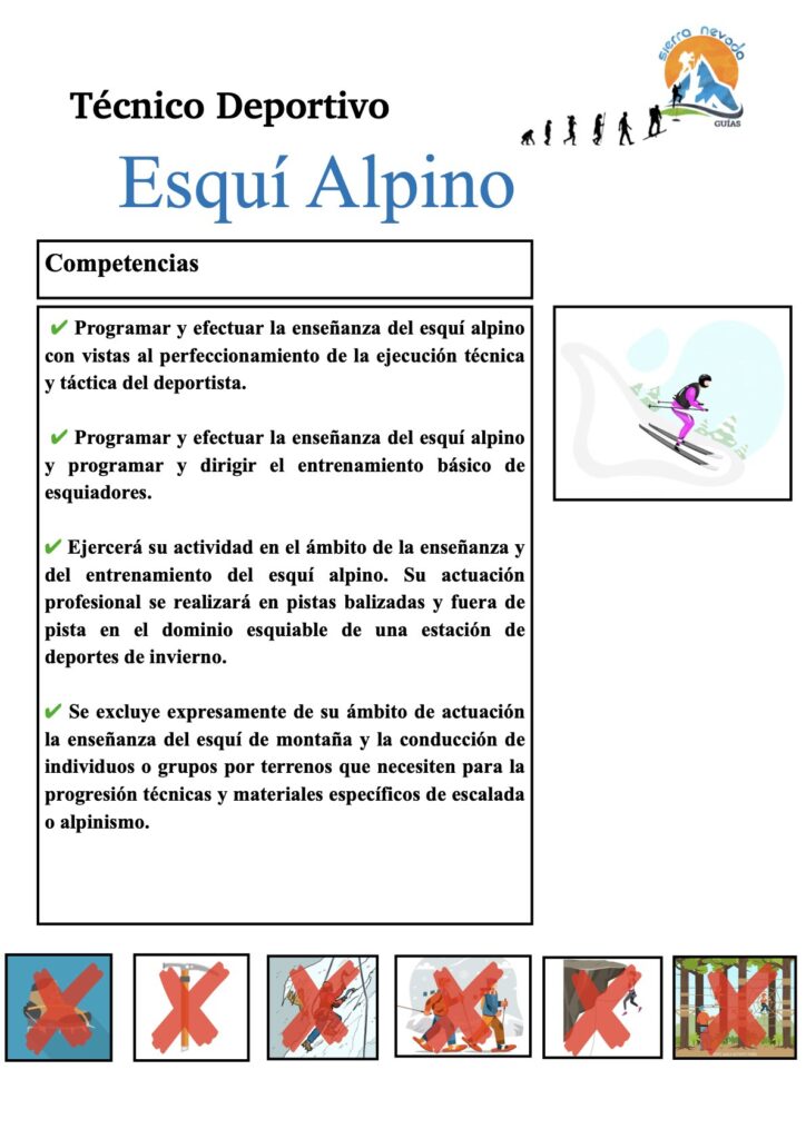 Podéis ver que no hemos incluido a los técnicos de Barrancos porque el medio acuático queda lejos de nuestro terreno principal de trabajo. Pero sin embargo hemos incluido a los técnicos de esquí alpino o profesores de esquí de pista (estaciones de esquí), pues hay muchos profesores de esquí alpino que imparten fuera de sus competencias cursos de esquí de montaña. El esquí de montaña está dentro de las competencias exclusivas de los Guías de Alta Montaña. Que no os lien. Los profesores de esquí, durante su formación, no dedican ni un sólo minuto al esquí de montaña. Todo su trabajo se limita al descenso dentro de las pistas balizadas. Algunos dicen erróneamente que dentro de los límites esquiables de las estaciones sí que pueden realizarlo, pero insistimos en que no es así.